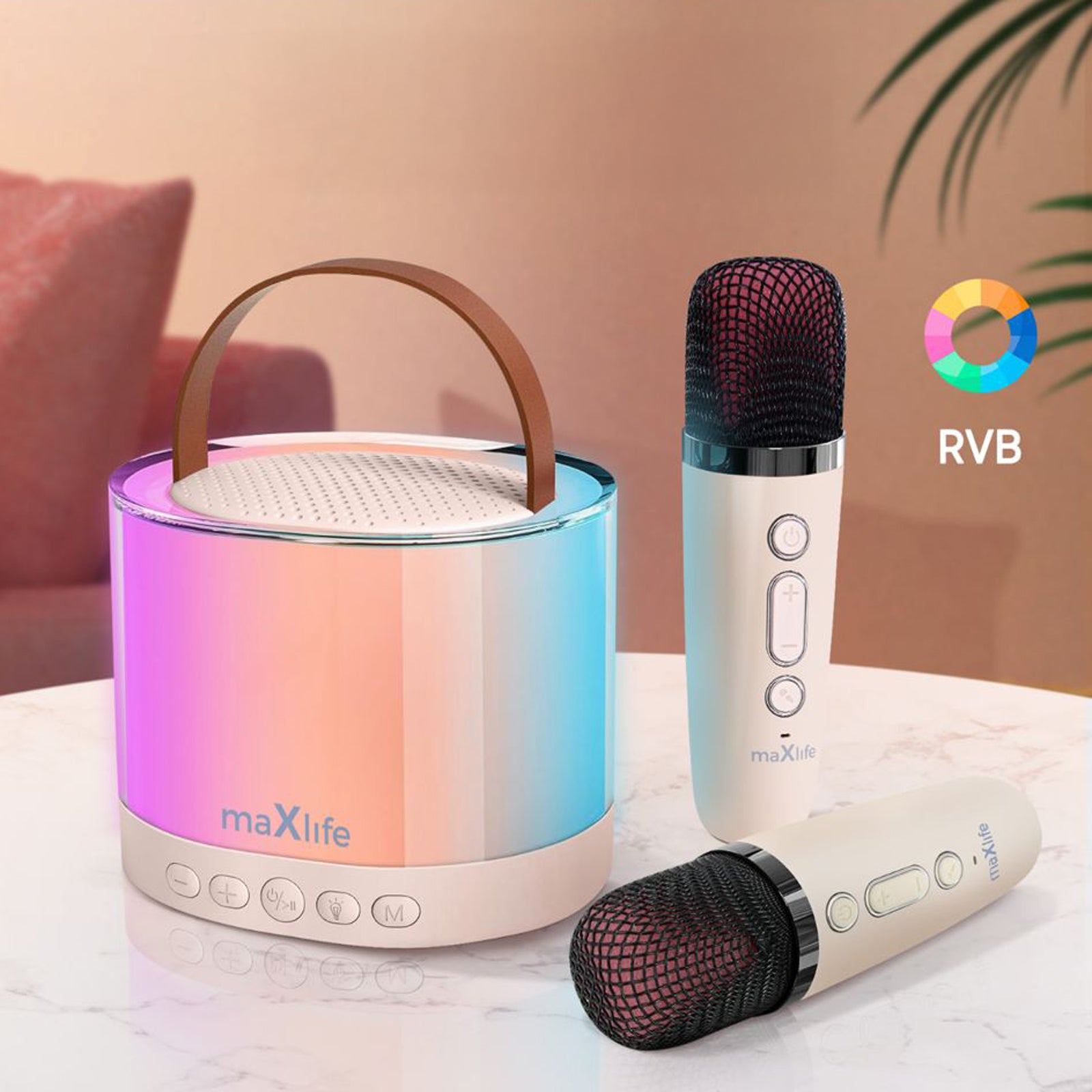 Pretvorite svaku prostoriju u karaoke pozornicu uz ovaj komplet koji uključuje Bluetooth zvučnik 5W i 2 bežična mikrofona. Kompaktan dizajn, dugotrajna baterija i RGB svjetlosni efekti osiguravaju zabavu za cijelu obitelj i prijatelje. Povežite ga putem Bluetooth 5.0, SD kartice ili 3.5mm jacka – i zapjevajte bez ograničenja! 🎶