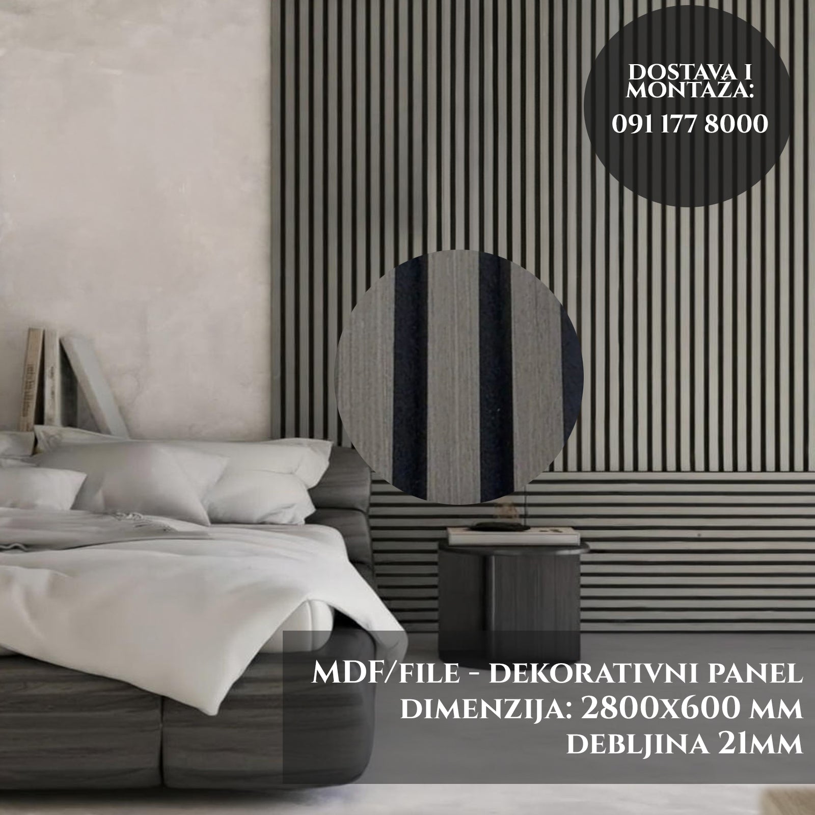 Panel je izrađen od vrhunskog MDF-a visoke gustoće, presvučenog specijalnom mat antracit folijom koja je otporna na ogrebotine i habanje. Mat završna obrada sprječava refleksiju svjetlosti, zadržavajući duboku boju pod svakim kutom.